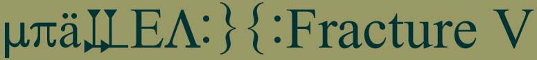 This piece is actually two pieces at the same time. The second half of the title (to the right of the ":}{:" divider) straightforwardly describes this piece as the fifth of my Fracture series. The portion of the title left of the divider is far less clear, which isn't surprising since the other half of this piece is another member of my BABEL series. The first two characters (μπ) and the last letter (Λ) are Greek transliterations of the latin letters "B" and "L" respectively. The "ä" and "E" are pretty obviously representitive of "A" and "E", but are meant to be taken as specifically German. The central character—which I can't represent without using an image because, stupidly, the internet still doesn't generally support Ugaritic cuneiform—represents "B". Put those together and you have, as with most pieces in this series, the word "BABEL", a reference to the Babylonian empire that was mythically afflicted by the Christian god with an impossible proliferation of languages. As will be explained more clearly below, there is a certain twisted mirroring in the piece's structure, and I tried to reflect that in the title's design. This is why the first and last letters of BABEL are both represented by Greek, and the second and penultimate characters are represented by German. But the mirroring is slightly bent by the use of lowercase on the left and uppercase on the right. There's also a happy accident in the title, since the last charcter in the first half of the title (Λ) is essentially an upside-down version of the last character of the second half (V), creating a coincidental horizontal mirroring to complement the vertical. Thanks, random happenstance! Overview: